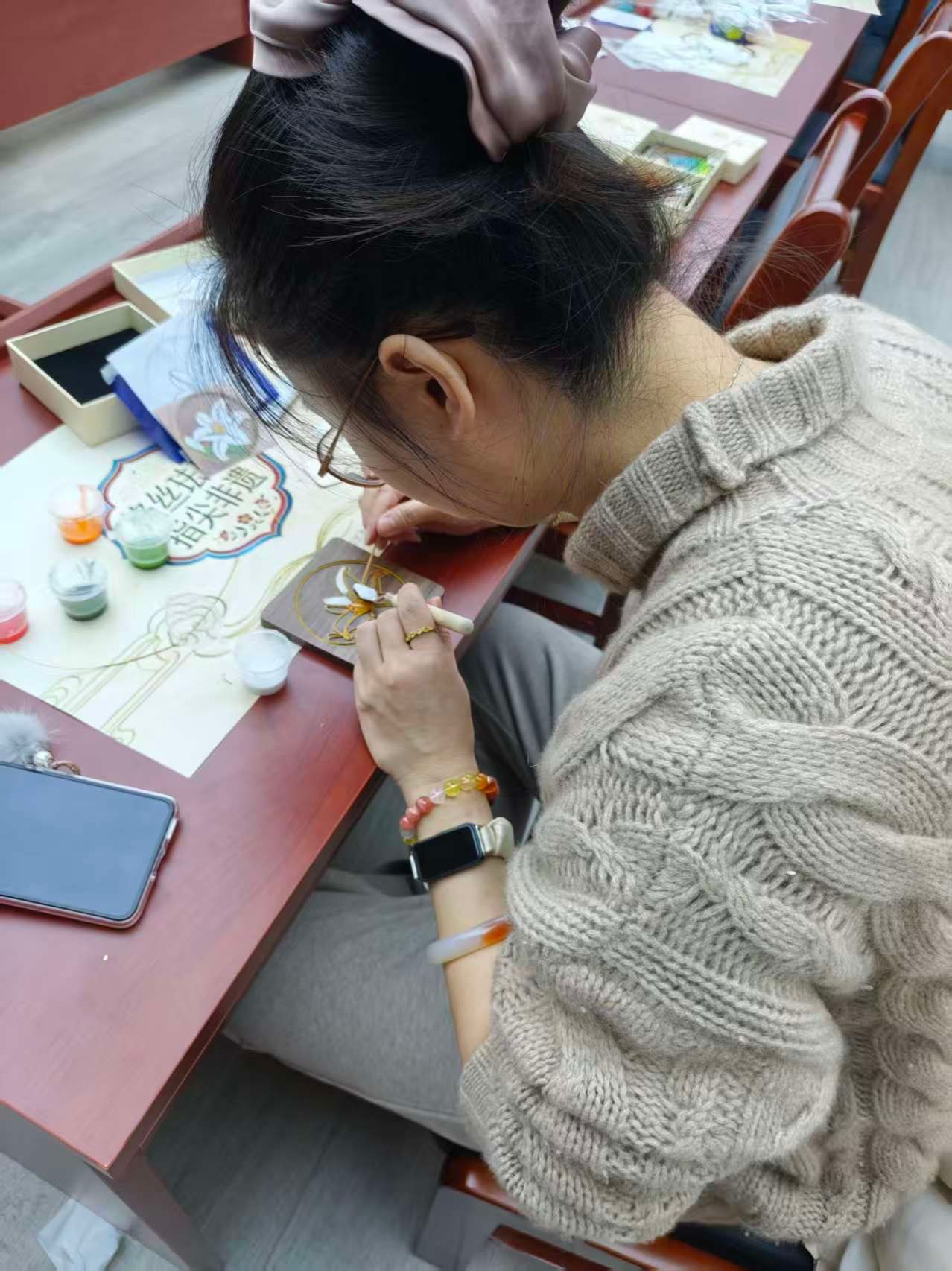 活动伊始,学院领导向全体女教师致以节日的诚挚问候与美好祝福,对她们在教育教学、科研管理各条战线上展现出的敬业精神与取得的丰硕成果给予高度评价,称赞她们以“巾帼不让须眉”的担当,为学院发展注入了不可或缺的力量。随后,指导老师详细讲解了掐丝珐琅工艺的历史渊源与制作流程。从描图、掐丝到点蓝、固沙,每一道工序都凝聚着匠心智慧。平日里伏案耕耘的女教师们,此刻化身为专注的手工匠人,她们手持镊子,屏息凝神,将柔软的扁铜丝小心翼翼地弯折、粘贴,或勾勒出清雅的兰草,或描绘出吉祥的纹样,在一弯一绕间感悟着传统技艺的精妙。